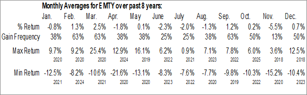 A word of caution: Only 7 years of data is available for shares of EMTY, perhaps insufficient to create a seasonal profile that accurately gauges the seasonal tendencies influencing the investment. Ideally, while 20 years is preferred, at least 10 years of data is required to perform a seasonal analysis that is considered to be reliable for future seasonal periods.