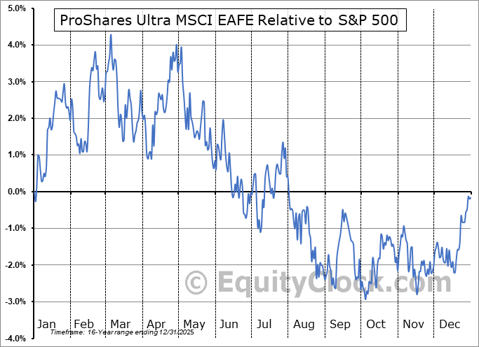 Analysis of the ProShares Ultra MSCI EAFE (NYSE:EFO) seasonal charts above shows that a Buy Date of November 30 and a Sell Date of February 23 has resulted in a geometric average return of 1.57% above the benchmark rate of the S&P 500 Total Return Index over the past 16 years. This seasonal timeframe has shown positive results compared to the benchmark in 13 of those periods. This is a very good rate of success and the return strongly outperforms the relative buy-and-hold performance of the stock over the past 16 years by an average of 8.61% per year.
