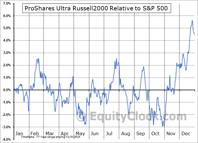 Analysis of the ProShares Ultra Russell2000 (NYSE:UWM) seasonal charts above shows that a Buy Date of November 20 and a Sell Date of February 15 has resulted in a geometric average return of 5.52% above the benchmark rate of the S&P 500 Total Return Index over the past 17 years. This seasonal timeframe has shown positive results compared to the benchmark in 13 of those periods. This is a good rate of success and the return strongly outperforms the relative buy-and-hold performance of the stock over the past 17 years by an average of 8.81% per year.