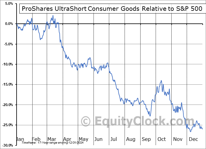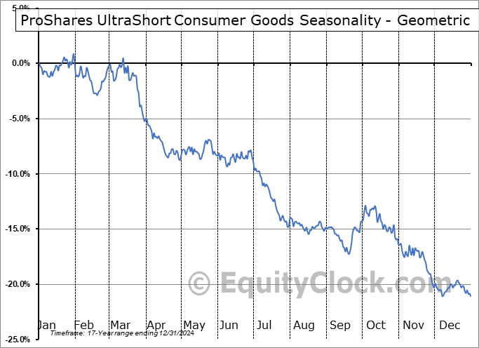 Analysis of the ProShares UltraShort Consumer Goods (NYSE:SZK) seasonal charts above shows that a Buy Date of July 21 and a Sell Date of October 9 has resulted in a geometric average return of 1.88% above the benchmark rate of the S&P 500 Total Return Index over the past 17 years. This seasonal timeframe has shown positive results compared to the benchmark in 9 of those periods. This is a poor rate of success and the return strongly outperforms the relative buy-and-hold performance of the stock over the past 17 years by an average of 30.82% per year.