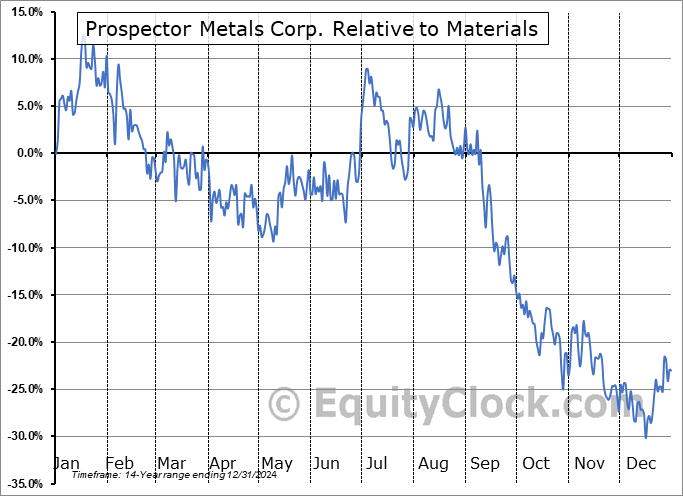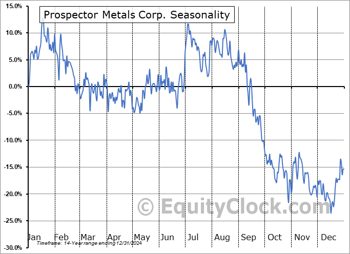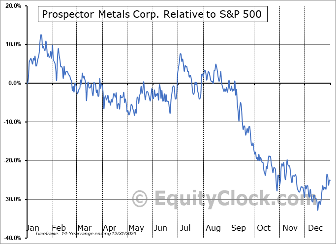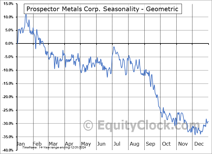 Analysis of the Prospector Metals Corp. (OTCMKT:PMCOF) seasonal charts above shows that a Buy Date of October 28 and a Sell Date of January 16 has resulted in a geometric average return of 10.29% above the benchmark rate of the S&P 500 Total Return Index over the past 14 years. This seasonal timeframe has shown positive results compared to the benchmark in 11 of those periods. This is a good rate of success and the return strongly outperforms the relative buy-and-hold performance of the stock over the past 14 years by an average of 48.08% per year.