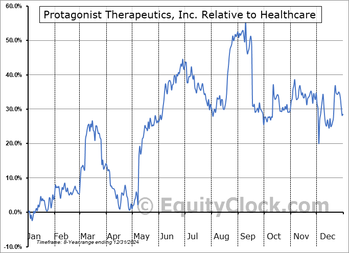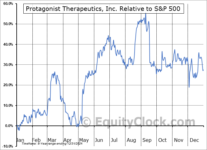 Analysis of the Protagonist Therapeutics, Inc. (NASD:PTGX) seasonal charts above shows that a Buy Date of May 7 and a Sell Date of September 3 has resulted in a geometric average return of 34.77% above the benchmark rate of the S&P 500 Total Return Index over the past 8 years. This seasonal timeframe has shown positive results compared to the benchmark in 7 of those periods. This is a very good rate of success and the return strongly outperforms the relative buy-and-hold performance of the stock over the past 8 years by an average of 40.69% per year.