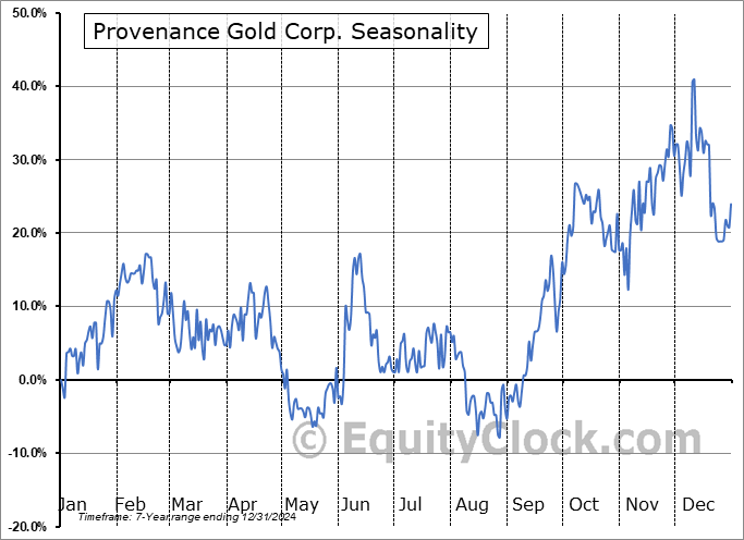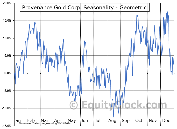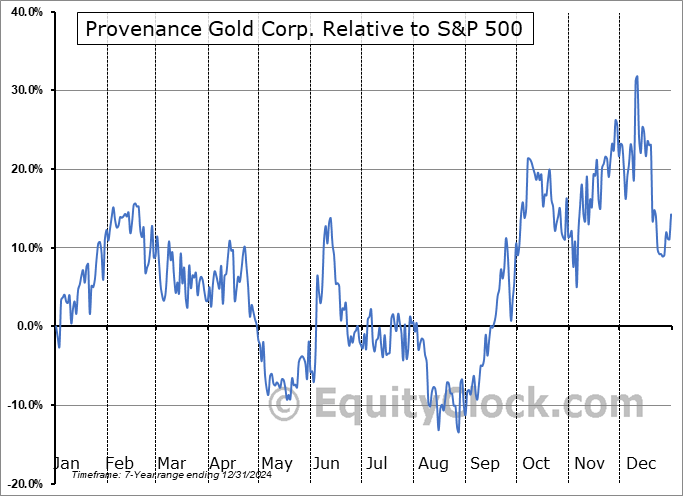 Analysis of the Provenance Gold Corp. (CSE:PAU.CA) seasonal charts above shows that a Buy Date of August 9 and a Sell Date of October 30 has resulted in a geometric average return of 25.03% above the benchmark rate of the S&P 500 Total Return Index over the past 7 years. This seasonal timeframe has shown positive results compared to the benchmark in 7 of those periods. This is an excellent rate of success and the return strongly outperforms the relative buy-and-hold performance of the stock over the past 7 years by an average of 35.23% per year.