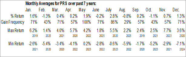 A word of caution: Only 7 years of data is available for shares of PRS, perhaps insufficient to create a seasonal profile that accurately gauges the seasonal tendencies influencing the investment. Ideally, while 20 years is preferred, at least 10 years of data is required to perform a seasonal analysis that is considered to be reliable for future seasonal periods.