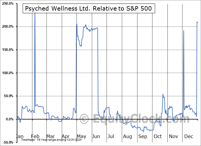 Analysis of the Psyched Wellness Ltd. (OTCMKT:PSYCF) seasonal charts above shows that a Buy Date of January 5 and a Sell Date of May 30 has resulted in a geometric average return of 21.68% above the benchmark rate of the S&P 500 Total Return Index over the past 19 years. This seasonal timeframe has shown positive results compared to the benchmark in 12 of those periods. This is a fair rate of success and the return strongly outperforms the relative buy-and-hold performance of the stock over the past 19 years by an average of 48.15% per year.