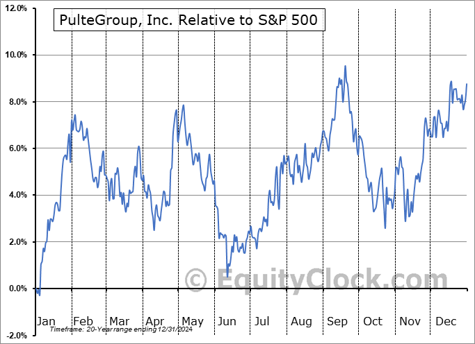 Analysis of the PulteGroup, Inc. (NYSE:PHM) seasonal charts above shows that a Buy Date of November 9 and a Sell Date of January 31 has resulted in a geometric average return of 11.72% above the benchmark rate of the S&P 500 Total Return Index over the past 20 years. This seasonal timeframe has shown positive results compared to the benchmark in 18 of those periods. This is an excellent rate of success and the return strongly outperforms the relative buy-and-hold performance of the stock over the past 20 years by an average of 14.35% per year.