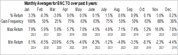 To download BNC.TO seasonal chart data, please log in or Subscribe.