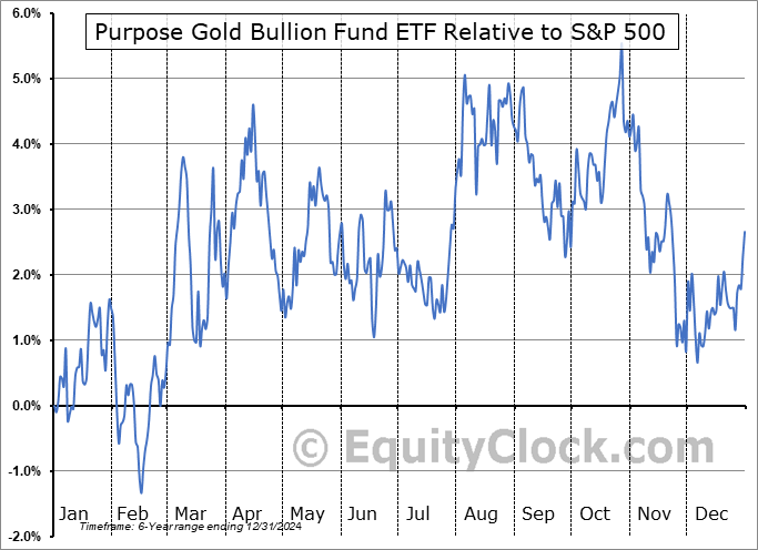 Analysis of the Purpose Gold Bullion Fund ETF (TSE:KILO.TO) seasonal charts above shows that a Buy Date of November 30 and a Sell Date of April 9 has resulted in a geometric average return of 5.57% above the benchmark rate of the S&P 500 Total Return Index over the past 6 years. This seasonal timeframe has shown positive results compared to the benchmark in 5 of those periods. This is a very good rate of success and the return strongly outperforms the relative buy-and-hold performance of the stock over the past 6 years by an average of 10.49% per year.