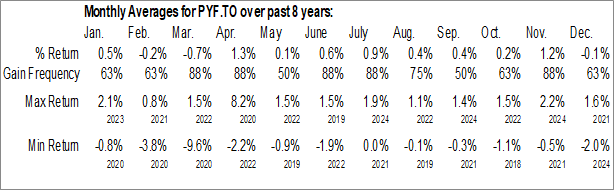 A word of caution: Only 8 years of data is available for shares of PYF.TO, perhaps insufficient to create a seasonal profile that accurately gauges the seasonal tendencies influencing the investment. Ideally, while 20 years is preferred, at least 10 years of data is required to perform a seasonal analysis that is considered to be reliable for future seasonal periods.