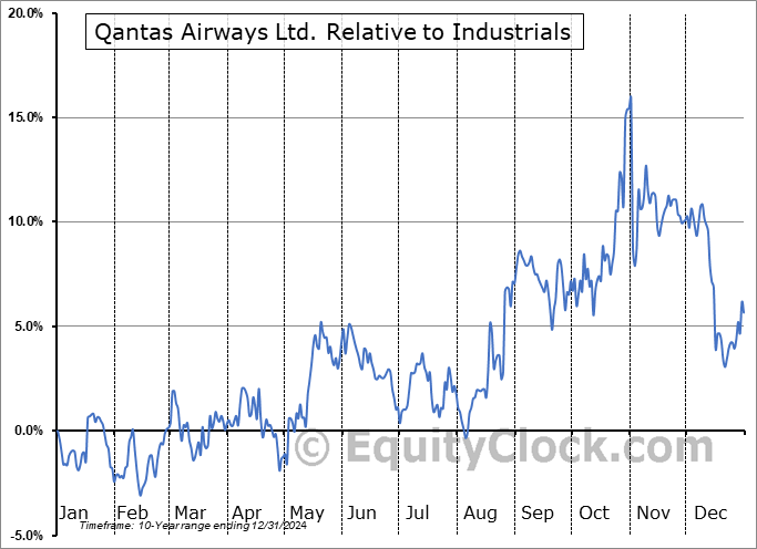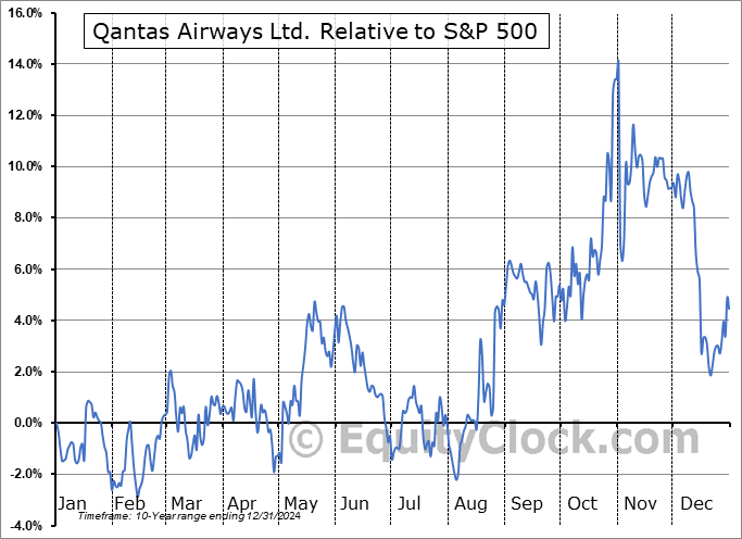 Analysis of the Qantas Airways Ltd. (OTCMKT:QABSY) seasonal charts above shows that a Buy Date of August 5 and a Sell Date of October 30 has resulted in a geometric average return of 13.42% above the benchmark rate of the S&P 500 Total Return Index over the past 10 years. This seasonal timeframe has shown positive results compared to the benchmark in 8 of those periods. This is a very good rate of success and the return strongly outperforms the relative buy-and-hold performance of the stock over the past 10 years by an average of 18.78% per year.