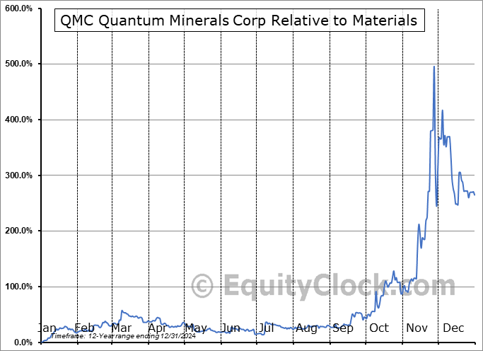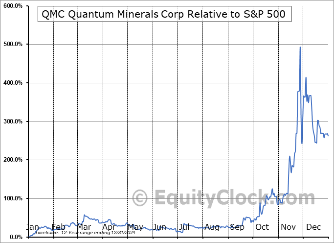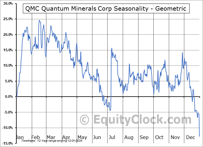 Analysis of the QMC Quantum Minerals Corp (OTCMKT:QMCQF) seasonal charts above shows that a Buy Date of November 19 and a Sell Date of February 15 has resulted in a geometric average return of 3.69% above the benchmark rate of the S&P 500 Total Return Index over the past 12 years. This seasonal timeframe has shown positive results compared to the benchmark in 8 of those periods. This is a good rate of success and the return strongly outperforms the relative buy-and-hold performance of the stock over the past 12 years by an average of 27.35% per year.