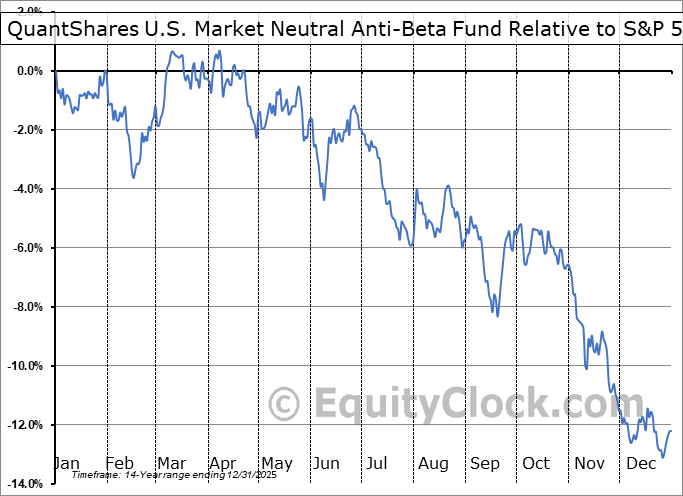 Analysis of the QuantShares U.S. Market Neutral Anti-Beta Fund (NYSE:BTAL) seasonal charts above shows that a Buy Date of March 5 and a Sell Date of May 24 has resulted in a geometric average return of 1.6% above the benchmark rate of the S&P 500 Total Return Index over the past 13 years. This seasonal timeframe has shown positive results compared to the benchmark in 9 of those periods. This is a good rate of success and the return strongly outperforms the relative buy-and-hold performance of the stock over the past 13 years by an average of 15.12% per year.