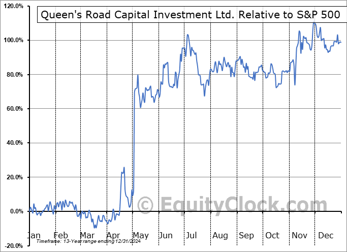 Analysis of the Queen’s Road Capital Investment Ltd. (TSE:QRC.TO) seasonal charts above shows that a Buy Date of July 21 and a Sell Date of November 11 has resulted in a geometric average return of 7.33% above the benchmark rate of the S&P 500 Total Return Index over the past 13 years. This seasonal timeframe has shown positive results compared to the benchmark in 10 of those periods. This is a good rate of success and the return strongly outperforms the relative buy-and-hold performance of the stock over the past 13 years by an average of 16.8% per year.