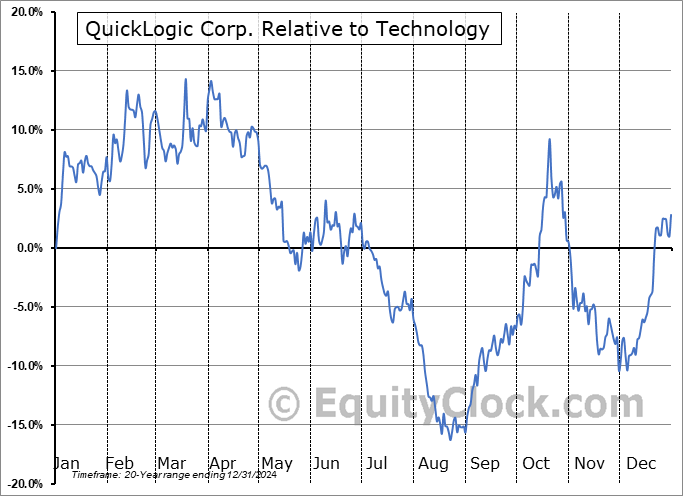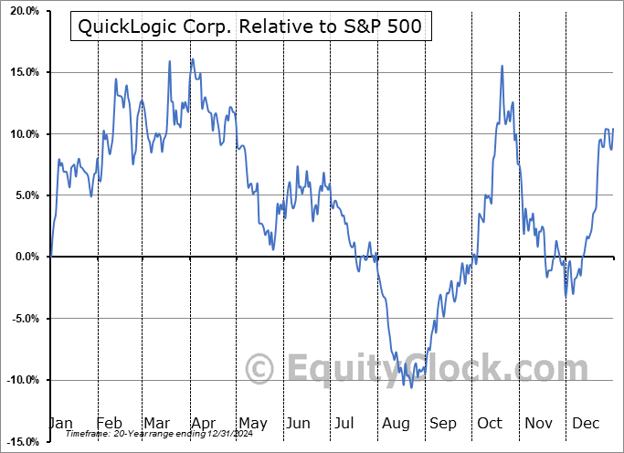 Analysis of the QuickLogic Corp. (NASD:QUIK) seasonal charts above shows that a Buy Date of November 15 and a Sell Date of February 6 has resulted in a geometric average return of 12.98% above the benchmark rate of the S&P 500 Total Return Index over the past 20 years. This seasonal timeframe has shown positive results compared to the benchmark in 15 of those periods. This is a good rate of success and the return strongly outperforms the relative buy-and-hold performance of the stock over the past 20 years by an average of 27.58% per year.