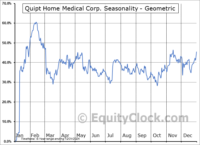 Analysis of the Quipt Home Medical Corp. (NASD:QIPT) seasonal charts above shows that a Buy Date of October 20 and a Sell Date of January 25 has resulted in a geometric average return of 43.15% above the benchmark rate of the S&P 500 Total Return Index over the past 6 years. This seasonal timeframe has shown positive results compared to the benchmark in 5 of those periods. This is a very good rate of success and the return strongly outperforms the relative buy-and-hold performance of the stock over the past 6 years by an average of 19.4% per year.