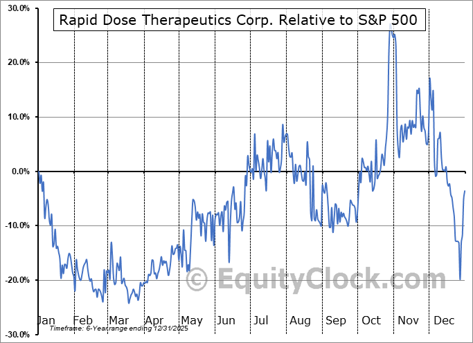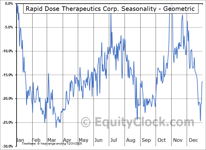 Analysis of the Rapid Dose Therapeutics Corp. (CSE:DOSE.CA) seasonal charts above shows that a Buy Date of March 19 and a Sell Date of August 1 has resulted in a geometric average return of 13.54% above the benchmark rate of the S&P 500 Total Return Index over the past 6 years. This seasonal timeframe has shown positive results compared to the benchmark in 5 of those periods. This is a very good rate of success and the return strongly outperforms the relative buy-and-hold performance of the stock over the past 6 years by an average of 49.42% per year.