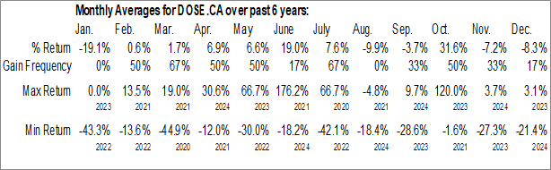 A word of caution: Only 6 years of data is available for shares of DOSE.CA, perhaps insufficient to create a seasonal profile that accurately gauges the seasonal tendencies influencing the investment. Ideally, while 20 years is preferred, at least 10 years of data is required to perform a seasonal analysis that is considered to be reliable for future seasonal periods.