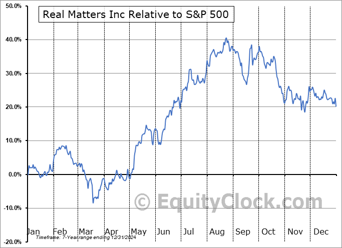 Analysis of the Real Matters Inc (TSE:REAL.TO) seasonal charts above shows that a Buy Date of March 18 and a Sell Date of July 11 has resulted in a geometric average return of 21.54% above the benchmark rate of the S&P 500 Total Return Index over the past 7 years. This seasonal timeframe has shown positive results compared to the benchmark in 6 of those periods. This is a very good rate of success and the return strongly outperforms the relative buy-and-hold performance of the stock over the past 7 years by an average of 38.6% per year.
