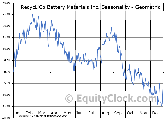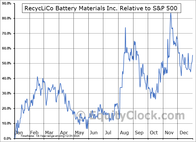 Analysis of the RecycLiCo Battery Materials Inc. (TSXV:AMY.V) seasonal charts above shows that a Buy Date of November 30 and a Sell Date of February 21 has resulted in a geometric average return of 25.36% above the benchmark rate of the S&P 500 Total Return Index over the past 18 years. This seasonal timeframe has shown positive results compared to the benchmark in 14 of those periods. This is a good rate of success and the return strongly outperforms the relative buy-and-hold performance of the stock over the past 18 years by an average of 40.08% per year.