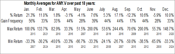 To download AMY.V seasonal chart data, please log in or Subscribe.