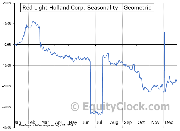 Analysis of the Red Light Holland Corp. (OTCMKT:TRUFF) seasonal charts above shows that a Buy Date of December 5 and a Sell Date of March 10 has resulted in a geometric average return of 4.2% above the benchmark rate of the S&P 500 Total Return Index over the past 19 years. This seasonal timeframe has shown positive results compared to the benchmark in 12 of those periods. This is a fair rate of success and the return strongly outperforms the relative buy-and-hold performance of the stock over the past 19 years by an average of 28.78% per year.