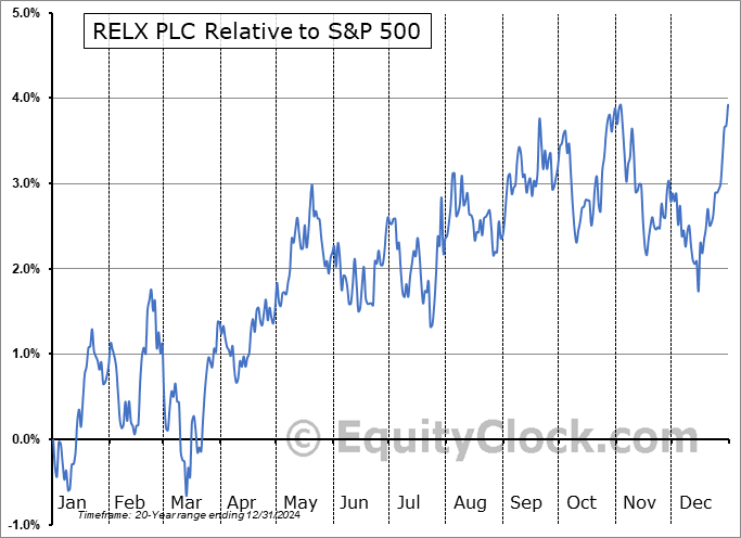 Analysis of the RELX PLC (NYSE:RELX) seasonal charts above shows that a Buy Date of December 15 and a Sell Date of May 12 has resulted in a geometric average return of 3.64% above the benchmark rate of the S&P 500 Total Return Index over the past 20 years. This seasonal timeframe has shown positive results compared to the benchmark in 15 of those periods. This is a good rate of success and the return strongly outperforms the relative buy-and-hold performance of the stock over the past 20 years by an average of 2.79% per year.