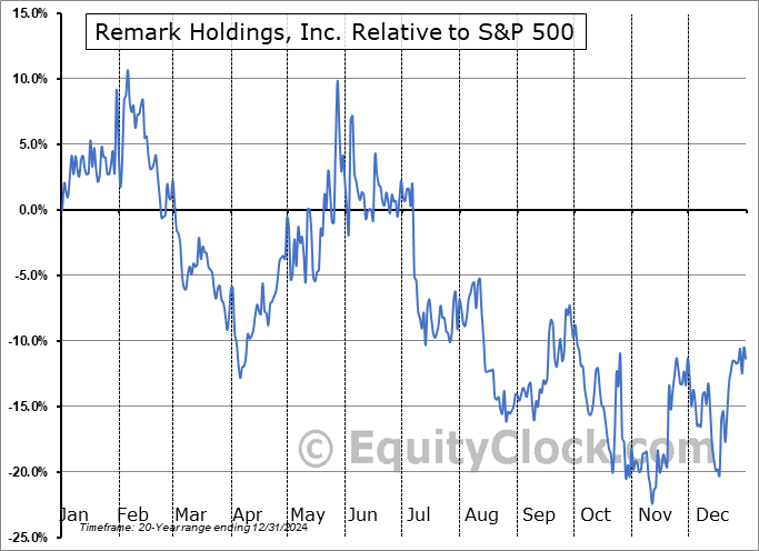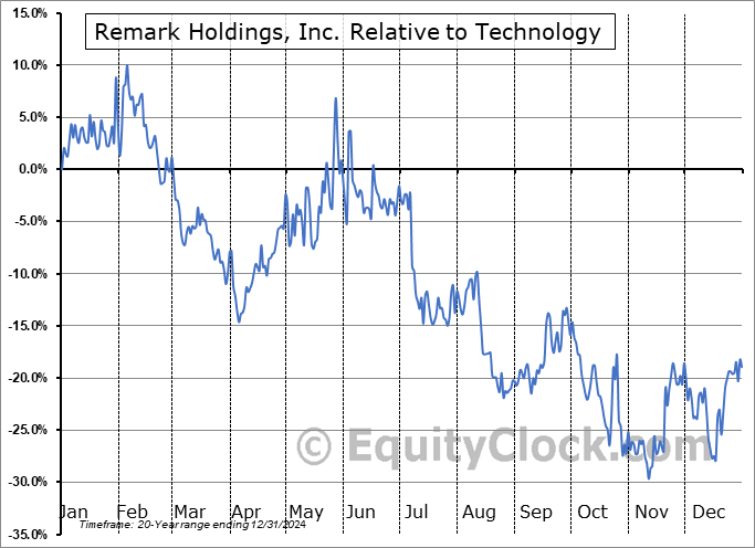 Analysis of the Remark Holdings, Inc. (NASD:MARK) seasonal charts above shows that a Buy Date of December 17 and a Sell Date of April 30 has resulted in a geometric average return of 0.64% above the benchmark rate of the S&P 500 Total Return Index over the past 20 years. This seasonal timeframe has shown positive results compared to the benchmark in 11 of those periods. This is a fair rate of success and the return strongly outperforms the relative buy-and-hold performance of the stock over the past 20 years by an average of 37.54% per year.