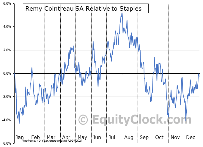 Analysis of the Remy Cointreau SA (OTCMKT:REMYY) seasonal charts above shows that a Buy Date of January 14 and a Sell Date of April 27 has resulted in a geometric average return of 4.45% above the benchmark rate of the S&P 500 Total Return Index over the past 10 years. This seasonal timeframe has shown positive results compared to the benchmark in 9 of those periods. This is an excellent rate of success and the return strongly outperforms the relative buy-and-hold performance of the stock over the past 10 years by an average of 15.75% per year.