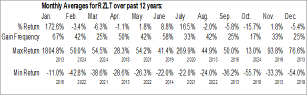To download RZLT seasonal chart data, please log in or Subscribe.