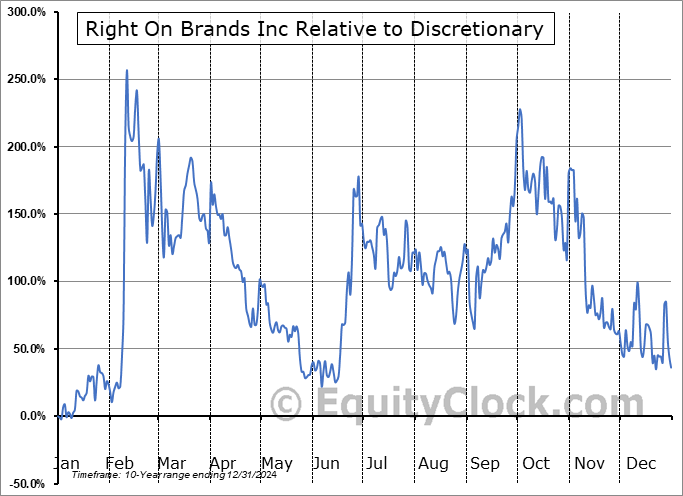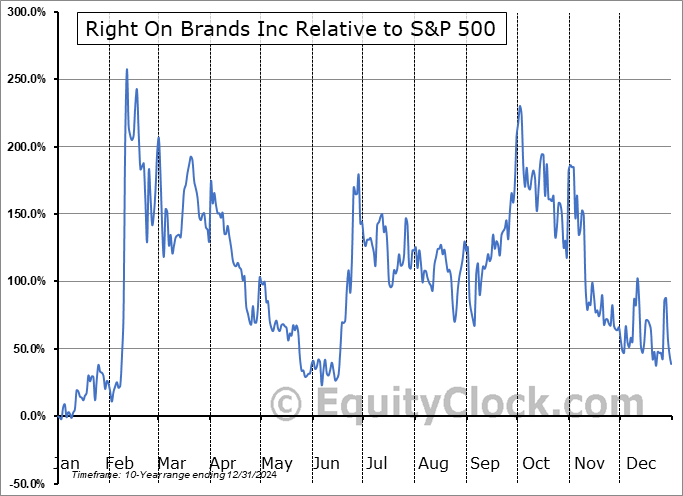 Analysis of the Right On Brands Inc (OTCMKT:RTON) seasonal charts above shows that a Buy Date of January 6 and a Sell Date of March 28 has resulted in a geometric average return of 23.79% above the benchmark rate of the S&P 500 Total Return Index over the past 10 years. This seasonal timeframe has shown positive results compared to the benchmark in 7 of those periods. This is a good rate of success and the return strongly outperforms the relative buy-and-hold performance of the stock over the past 10 years by an average of 83.98% per year.