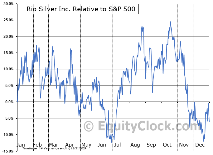 Analysis of the Rio Silver Inc. (TSXV:RYO.V) seasonal charts above shows that a Buy Date of November 11 and a Sell Date of February 6 has resulted in a geometric average return of 3.12% above the benchmark rate of the S&P 500 Total Return Index over the past 14 years. This seasonal timeframe has shown positive results compared to the benchmark in 11 of those periods. This is a good rate of success and the return strongly outperforms the relative buy-and-hold performance of the stock over the past 14 years by an average of 36.49% per year.