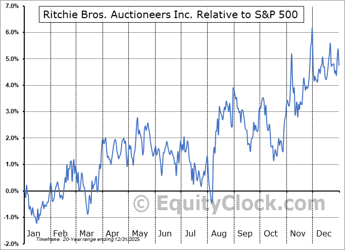 Analysis of the Ritchie Bros. Auctioneers Inc. (TSE:RBA.TO) seasonal charts above shows that a Buy Date of August 6 and a Sell Date of November 5 has resulted in a geometric average return of 4.09% above the benchmark rate of the S&P 500 Total Return Index over the past 20 years. This seasonal timeframe has shown positive results compared to the benchmark in 15 of those periods. This is a good rate of success and the return outperforms the relative buy-and-hold performance of the stock over the past 20 years by an average of 1.85% per year.