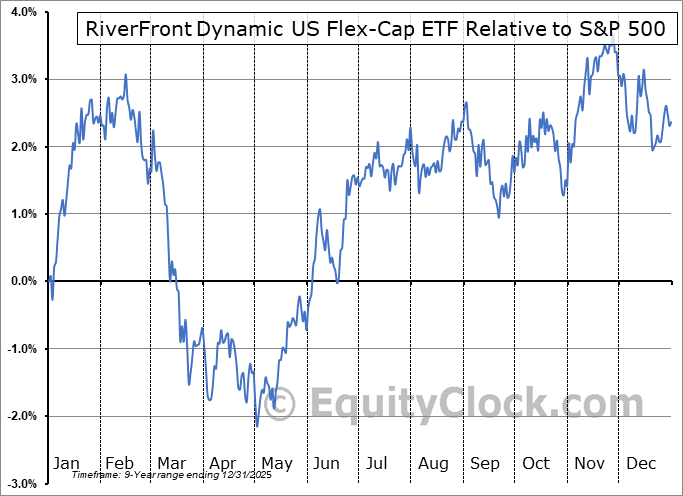 Analysis of the RiverFront Dynamic US Flex-Cap ETF (AMEX:RFFC) seasonal charts above shows that a Buy Date of September 7 and a Sell Date of January 7 has resulted in a geometric average return of 0.33% above the benchmark rate of the S&P 500 Total Return Index over the past 8 years. This seasonal timeframe has shown positive results compared to the benchmark in 6 of those periods. This is a good rate of success and the return strongly outperforms the relative buy-and-hold performance of the stock over the past 8 years by an average of 3.38% per year.