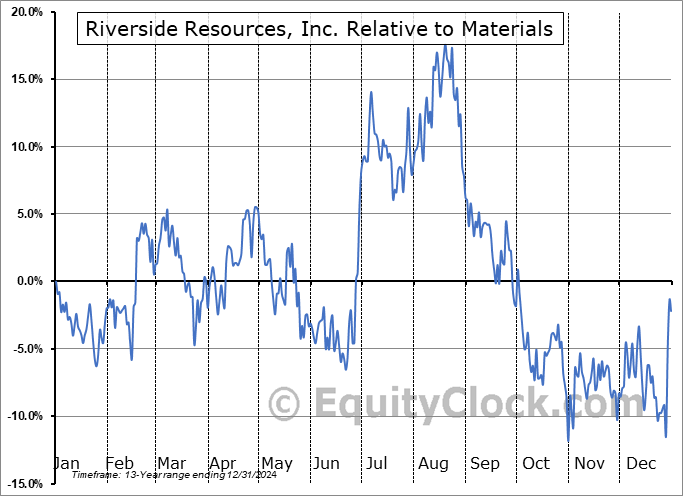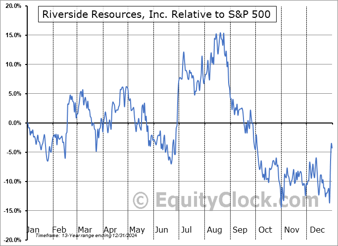 Analysis of the Riverside Resources, Inc. (OTCMKT:RVSDF) seasonal charts above shows that a Buy Date of November 29 and a Sell Date of March 4 has resulted in a geometric average return of 6.97% above the benchmark rate of the S&P 500 Total Return Index over the past 13 years. This seasonal timeframe has shown positive results compared to the benchmark in 9 of those periods. This is a good rate of success and the return strongly outperforms the relative buy-and-hold performance of the stock over the past 13 years by an average of 32.52% per year.