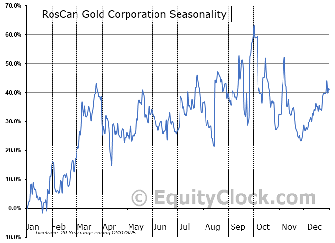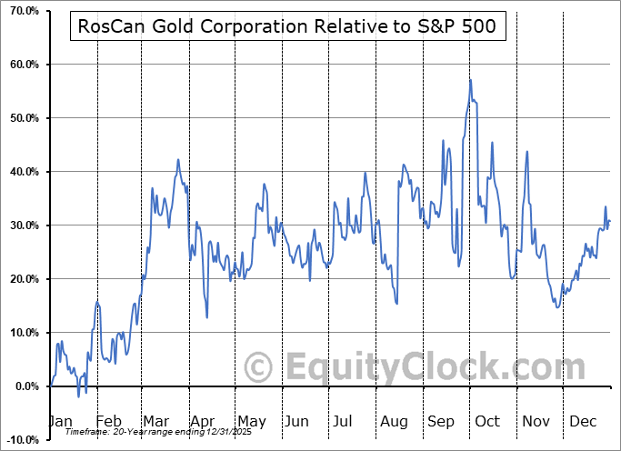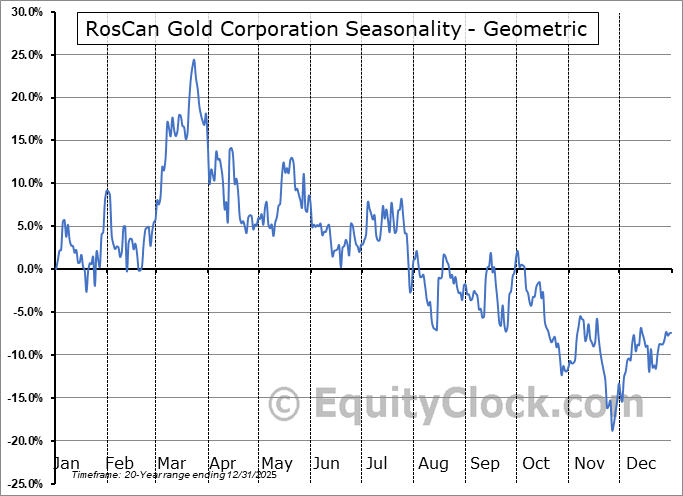 Analysis of the RosCan Gold Corporation (TSXV:ROS.V) seasonal charts above shows that a Buy Date of December 23 and a Sell Date of March 25 has resulted in a geometric average return of 22.41% above the benchmark rate of the S&P 500 Total Return Index over the past 20 years. This seasonal timeframe has shown positive results compared to the benchmark in 16 of those periods. This is a very good rate of success and the return strongly outperforms the relative buy-and-hold performance of the stock over the past 20 years by an average of 38.62% per year.