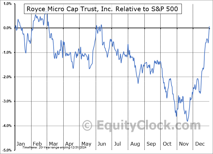 Analysis of the Royce Micro Cap Trust, Inc. (NYSE:RMT) seasonal charts above shows that a Buy Date of November 20 and a Sell Date of February 27 has resulted in a geometric average return of 4.22% above the benchmark rate of the S&P 500 Total Return Index over the past 20 years. This seasonal timeframe has shown positive results compared to the benchmark in 16 of those periods. This is a very good rate of success and the return strongly outperforms the relative buy-and-hold performance of the stock over the past 20 years by an average of 7.1% per year.
