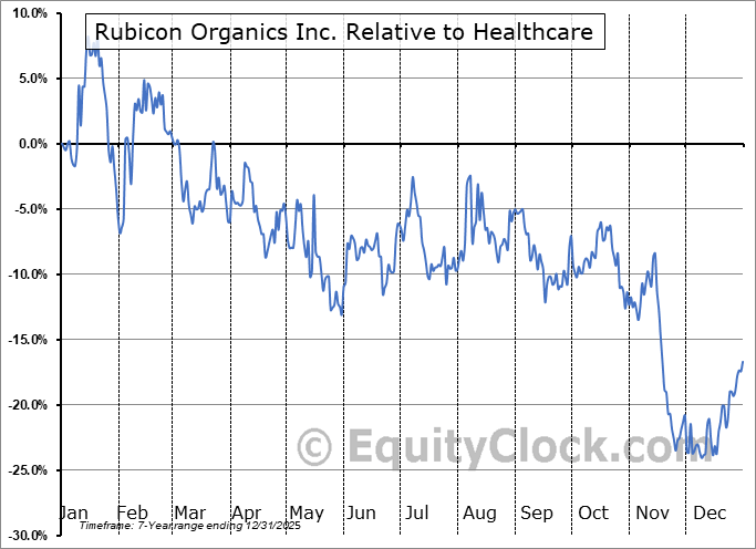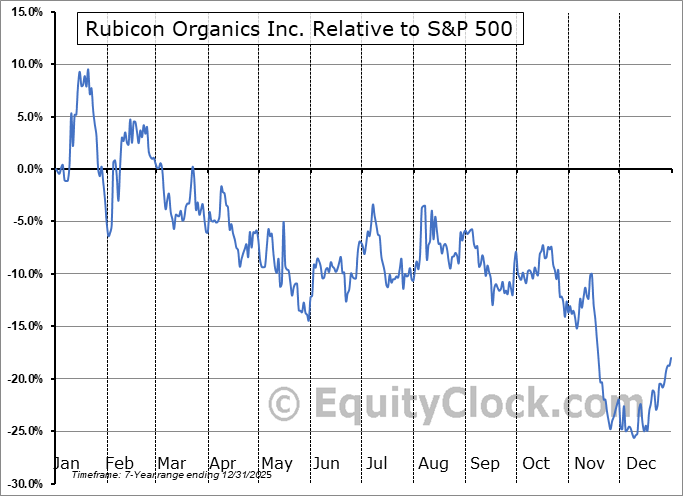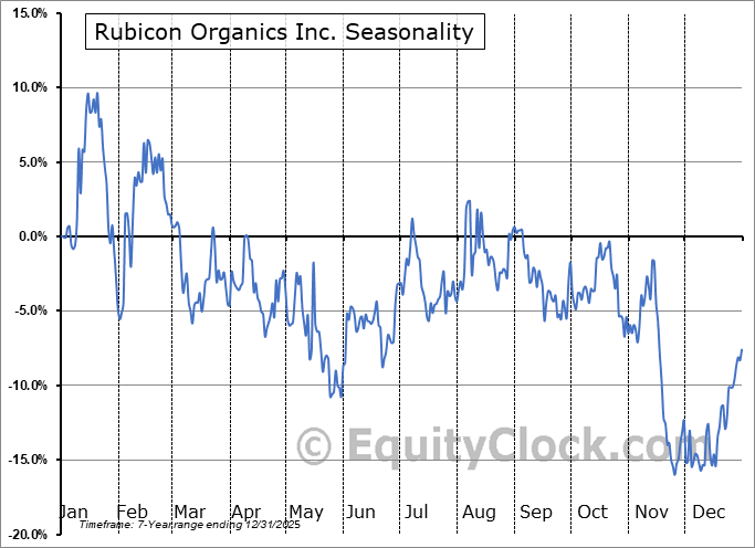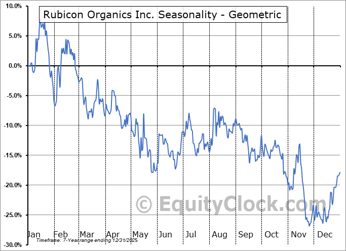 Analysis of the Rubicon Organics Inc. (TSXV:ROMJ.V) seasonal charts above shows that a Buy Date of November 25 and a Sell Date of February 17 has resulted in a geometric average return of 9.59% above the benchmark rate of the S&P 500 Total Return Index over the past 7 years. This seasonal timeframe has shown positive results compared to the benchmark in 5 of those periods. This is a good rate of success and the return strongly outperforms the relative buy-and-hold performance of the stock over the past 7 years by an average of 39.21% per year.