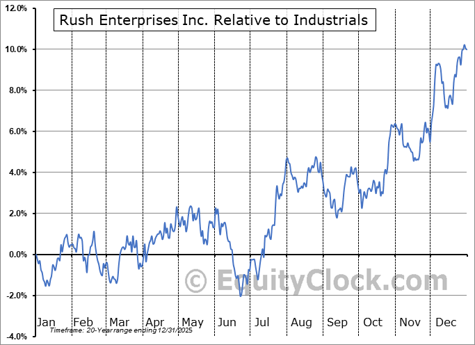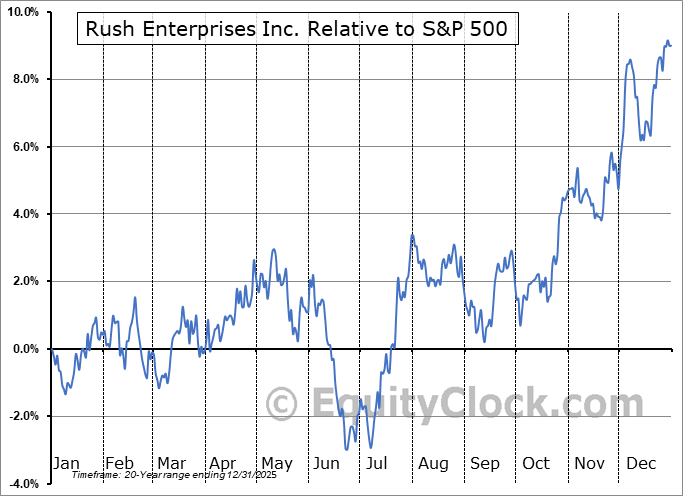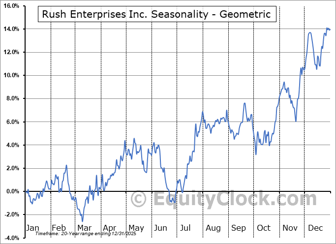 Analysis of the Rush Enterprises Inc. (NASD:RUSHA) seasonal charts above shows that a Buy Date of September 25 and a Sell Date of February 12 has resulted in a geometric average return of 4.19% above the benchmark rate of the S&P 500 Total Return Index over the past 20 years. This seasonal timeframe has shown positive results compared to the benchmark in 17 of those periods. This is a very good rate of success and the return outperforms the relative buy-and-hold performance of the stock over the past 20 years by an average of 1.23% per year.