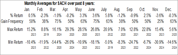 A word of caution: Only 7 years of data is available for shares of SACH, perhaps insufficient to create a seasonal profile that accurately gauges the seasonal tendencies influencing the investment. Ideally, while 20 years is preferred, at least 10 years of data is required to perform a seasonal analysis that is considered to be reliable for future seasonal periods.