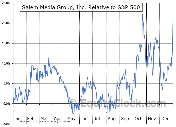 Analysis of the Salem Media Group, Inc. (OTCMKT:SALM) seasonal charts above shows that a Buy Date of December 29 and a Sell Date of March 22 has resulted in a geometric average return of 5.26% above the benchmark rate of the S&P 500 Total Return Index over the past 20 years. This seasonal timeframe has shown positive results compared to the benchmark in 11 of those periods. This is a fair rate of success and the return strongly outperforms the relative buy-and-hold performance of the stock over the past 20 years by an average of 27.58% per year.