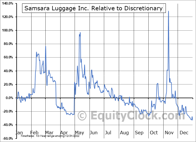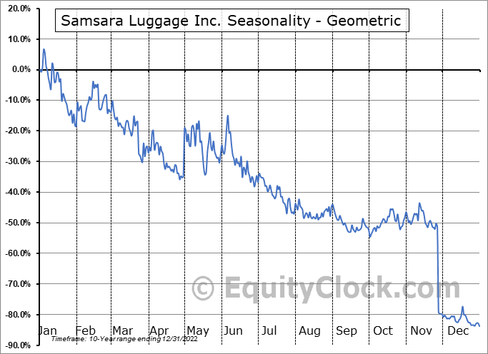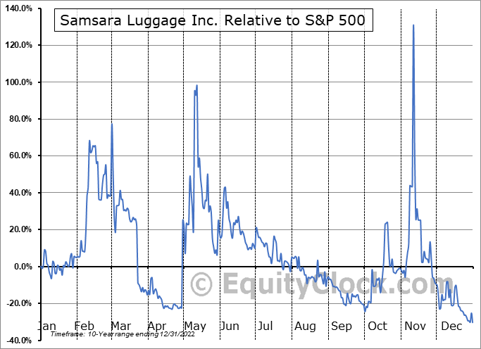 Analysis of the Samsara Luggage Inc. (OTCMKT:SAML) seasonal charts above shows that a Buy Date of August 17 and a Sell Date of November 11 has resulted in a geometric average return of 11.03% above the benchmark rate of the S&P 500 Total Return Index over the past 10 years. This seasonal timeframe has shown positive results compared to the benchmark in 3 of those periods. This is a poor rate of success and the return strongly outperforms the relative buy-and-hold performance of the stock over the past 10 years by an average of 111.03% per year.