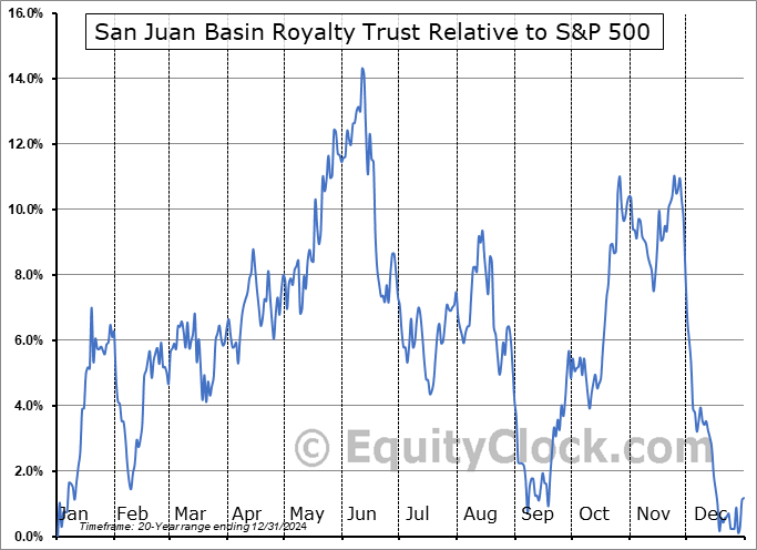 Analysis of the San Juan Basin Royalty Trust (NYSE:SJT) seasonal charts above shows that a Buy Date of January 8 and a Sell Date of April 12 has resulted in a geometric average return of 2.74% above the benchmark rate of the S&P 500 Total Return Index over the past 20 years. This seasonal timeframe has shown positive results compared to the benchmark in 15 of those periods. This is a good rate of success and the return strongly outperforms the relative buy-and-hold performance of the stock over the past 20 years by an average of 14.62% per year.