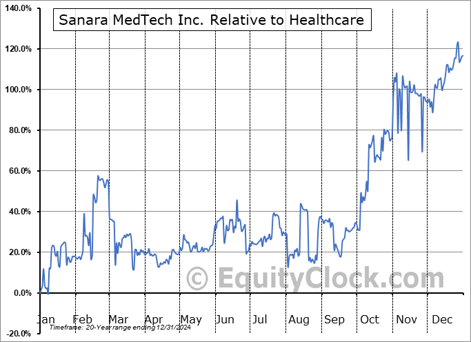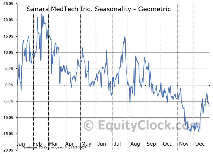 Analysis of the Sanara MedTech Inc. (NASD:SMTI) seasonal charts above shows that a Buy Date of December 3 and a Sell Date of March 13 has resulted in a geometric average return of 21.57% above the benchmark rate of the S&P 500 Total Return Index over the past 20 years. This seasonal timeframe has shown positive results compared to the benchmark in 17 of those periods. This is a very good rate of success and the return strongly outperforms the relative buy-and-hold performance of the stock over the past 20 years by an average of 35.87% per year.