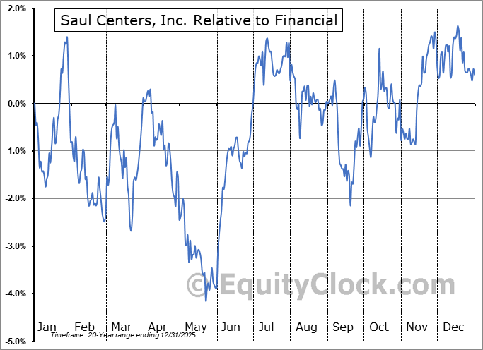Analysis of the Saul Centers, Inc. (NYSE:BFS) seasonal charts above shows that a Buy Date of May 13 and a Sell Date of August 1 has resulted in a geometric average return of 2.64% above the benchmark rate of the S&P 500 Total Return Index over the past 20 years. This seasonal timeframe has shown positive results compared to the benchmark in 16 of those periods. This is a very good rate of success and the return strongly outperforms the relative buy-and-hold performance of the stock over the past 20 years by an average of 7.71% per year.