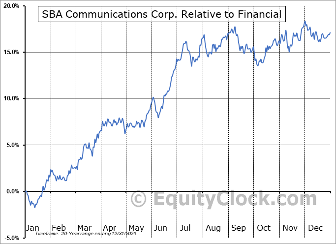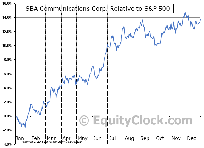 Analysis of the SBA Communications Corp. (NASD:SBAC) seasonal charts above shows that a Buy Date of February 24 and a Sell Date of July 11 has resulted in a geometric average return of 7.85% above the benchmark rate of the S&P 500 Total Return Index over the past 20 years. This seasonal timeframe has shown positive results compared to the benchmark in 16 of those periods. This is a very good rate of success and the return outperforms the relative buy-and-hold performance of the stock over the past 20 years by an average of 1.62% per year.