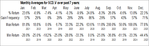 A word of caution: Only 6 years of data is available for shares of SCD.V, perhaps insufficient to create a seasonal profile that accurately gauges the seasonal tendencies influencing the investment. Ideally, while 20 years is preferred, at least 10 years of data is required to perform a seasonal analysis that is considered to be reliable for future seasonal periods.