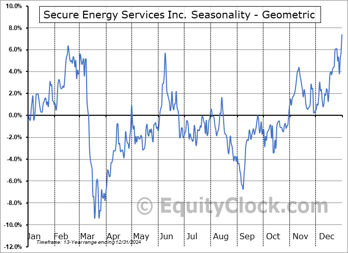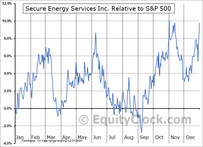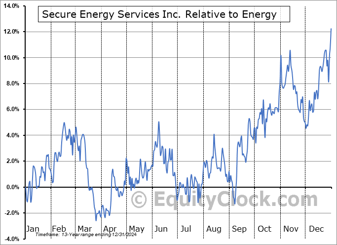 Analysis of the Secure Energy Services Inc. (OTCMKT:SECYF) seasonal charts above shows that a Buy Date of October 4 and a Sell Date of January 28 has resulted in a geometric average return of 3.86% above the benchmark rate of the S&P 500 Total Return Index over the past 13 years. This seasonal timeframe has shown positive results compared to the benchmark in 11 of those periods. This is a very good rate of success and the return strongly outperforms the relative buy-and-hold performance of the stock over the past 13 years by an average of 11.03% per year.