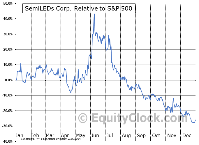 Analysis of the SemiLEDs Corp. (NASD:LEDS) seasonal charts above shows that a Buy Date of January 18 and a Sell Date of April 12 has resulted in a geometric average return of 0.36% above the benchmark rate of the S&P 500 Total Return Index over the past 14 years. This seasonal timeframe has shown positive results compared to the benchmark in 10 of those periods. This is a good rate of success and the return strongly outperforms the relative buy-and-hold performance of the stock over the past 14 years by an average of 40.27% per year.