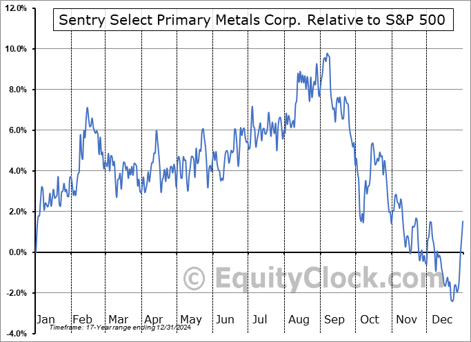 Analysis of the Sentry Select Primary Metals Corp. (TSE:PME.TO) seasonal charts above shows that a Buy Date of December 19 and a Sell Date of March 22 has resulted in a geometric average return of 7.73% above the benchmark rate of the S&P 500 Total Return Index over the past 17 years. This seasonal timeframe has shown positive results compared to the benchmark in 12 of those periods. This is a good rate of success and the return strongly outperforms the relative buy-and-hold performance of the stock over the past 17 years by an average of 15.4% per year.