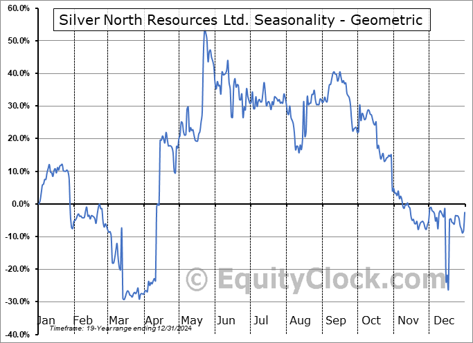 Analysis of the Silver North Resources Ltd. (OTCMKT:TARSF) seasonal charts above shows that a Buy Date of December 30 and a Sell Date of May 3 has resulted in a geometric average return of 26.96% above the benchmark rate of the S&P 500 Total Return Index over the past 19 years. This seasonal timeframe has shown positive results compared to the benchmark in 13 of those periods. This is a good rate of success and the return strongly outperforms the relative buy-and-hold performance of the stock over the past 19 years by an average of 38.75% per year.